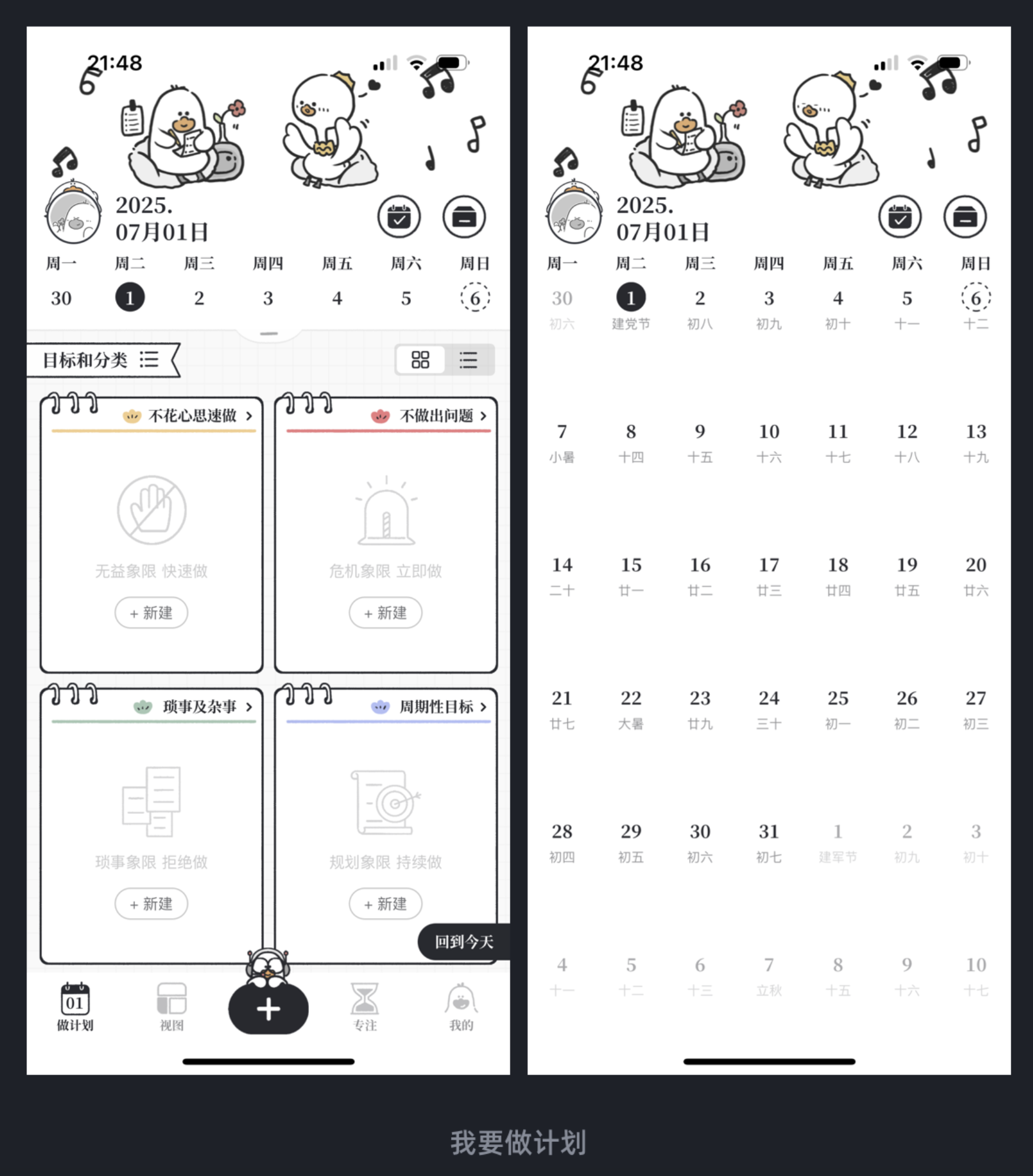 “我要做計(jì)劃” App 不僅日歷下拉展開(kāi) / 收起的交互便利,還在左右切換時(shí)模擬翻頁(yè)聲效,搭配涂鴉式設(shè)計(jì)風(fēng)格,增強(qiáng)了場(chǎng)景代入感。
