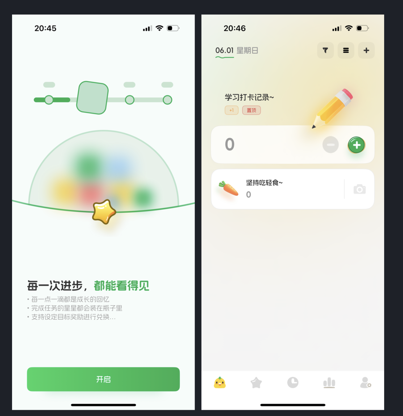 “星習(xí)慣” App 集習(xí)慣養(yǎng)成、學(xué)習(xí)打卡、生活記錄等功能于一體,其 UI 設(shè)計(jì)區(qū)別于大眾化風(fēng)格,符合年輕用戶(hù)審美,交互邏輯也值得學(xué)習(xí),用戶(hù)可通過(guò)完成任務(wù)收集 “星星”,還能設(shè)置目標(biāo)獎(jiǎng)勵(lì)等。