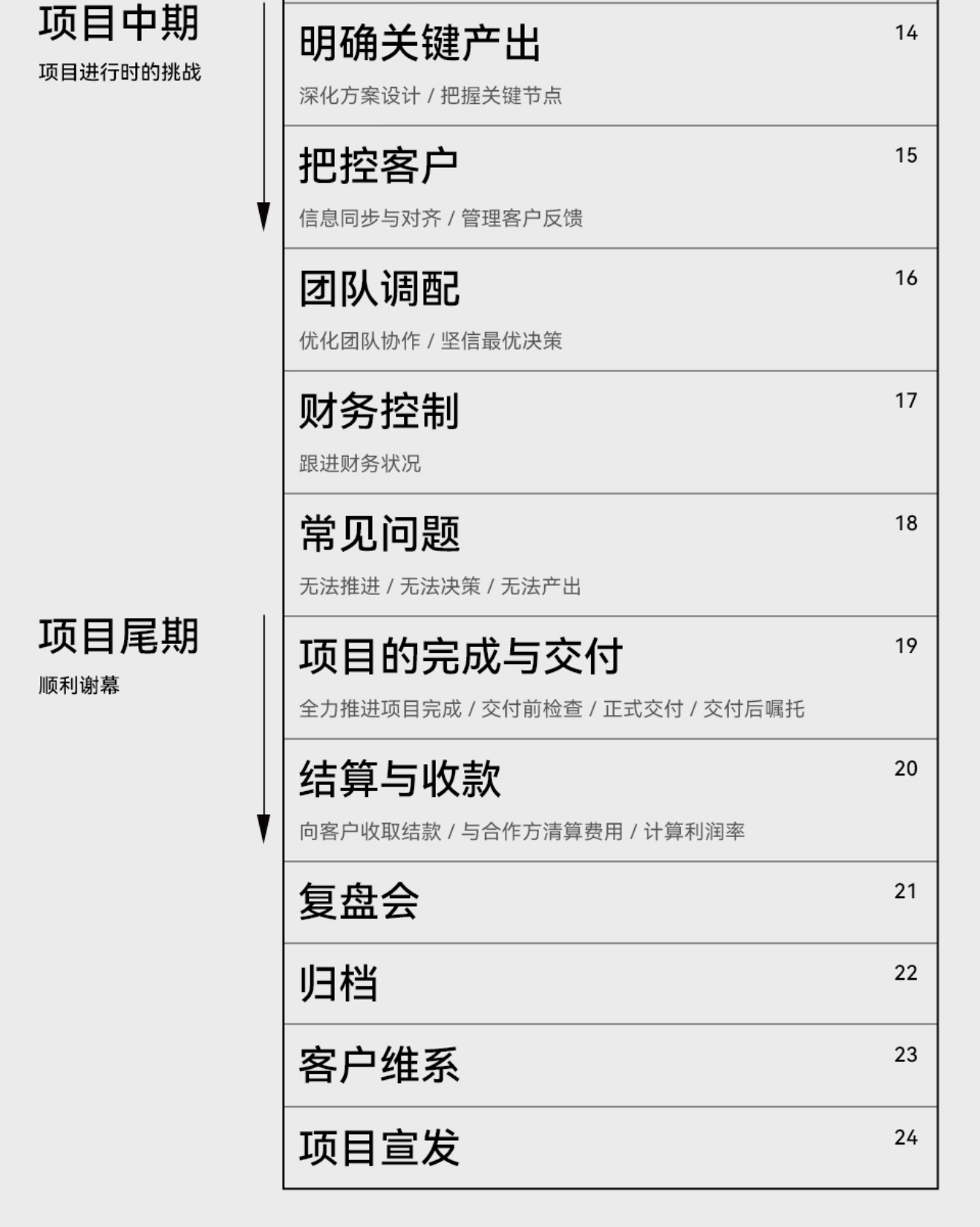 6. 項(xiàng)目尾期(順利謝幕):完成項(xiàng)目并交付,全力推進(jìn)項(xiàng)目完成,做好交付前檢查、正式交付及交付后囑托;進(jìn)行結(jié)算與收款,向客戶收取結(jié)款、與合作方清算費(fèi)用并計(jì)算利潤率;召開復(fù)盤會(huì),對(duì)項(xiàng)目進(jìn)行總結(jié);做好項(xiàng)目歸檔、客戶維系及項(xiàng)目宣發(fā)工作。