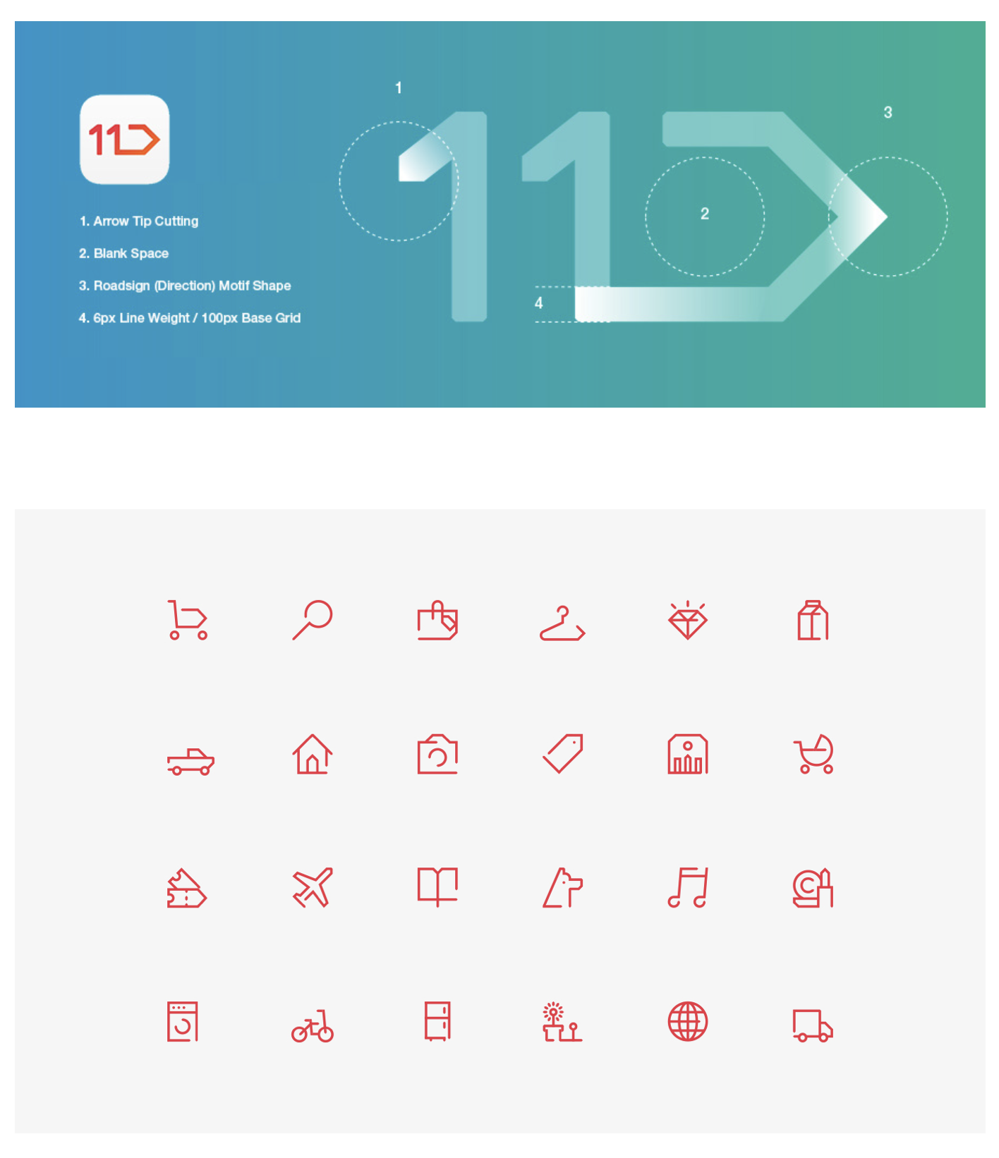 - 案例 1:韓國電商 “11 街” 的功能圖標(biāo)延續(xù)了 logo 的圖形特點(diǎn),區(qū)別于競(jìng)品,增強(qiáng)用戶認(rèn)知。