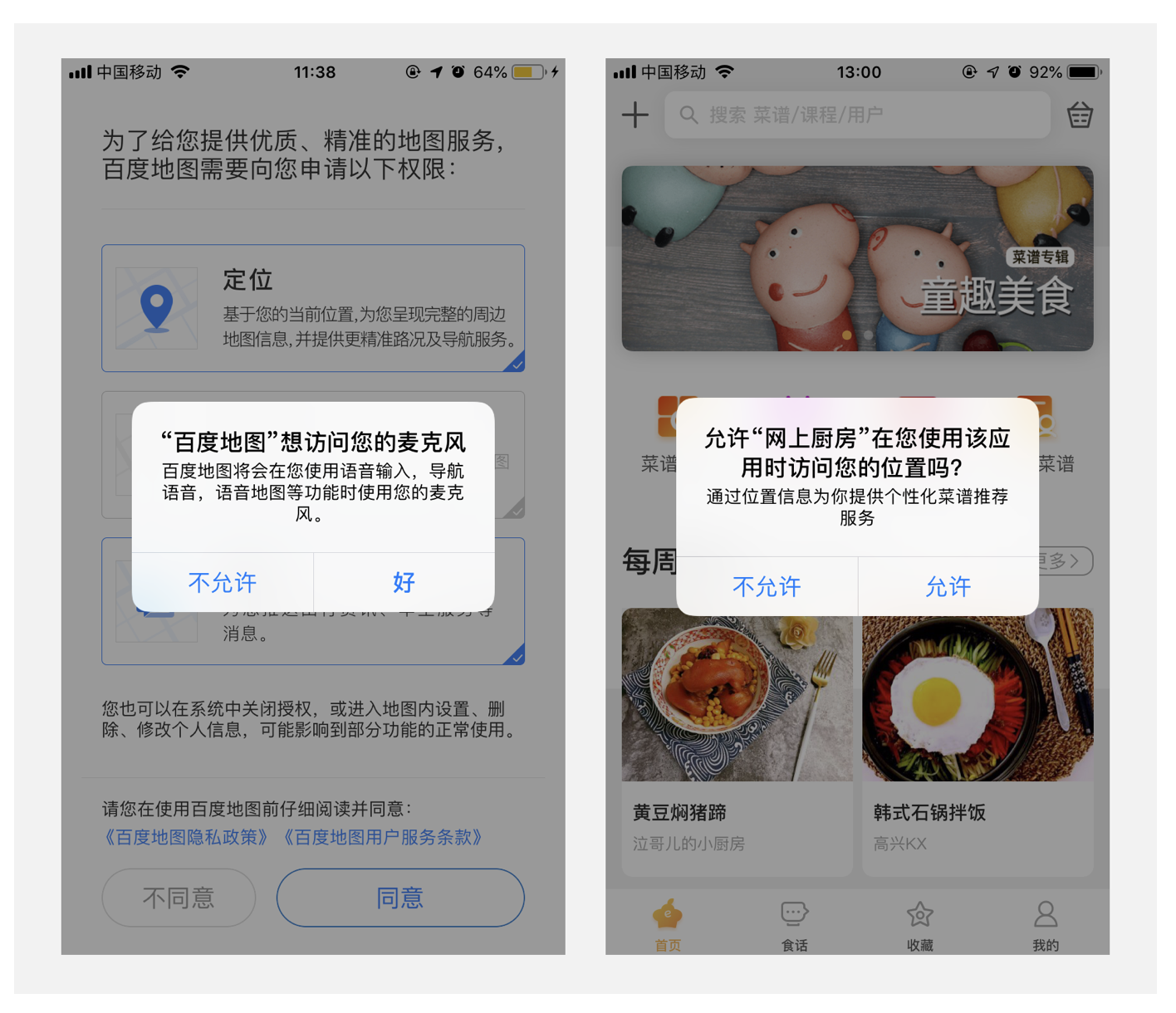 - 系統(tǒng)功能的授權(quán):如 “百度地圖” 申請訪問麥克風(fēng)、“網(wǎng)上廚房” 申請訪問位置的彈窗,這類屬于系統(tǒng)自帶的授權(quán)彈窗,在許多 APP 中都較為常見。
