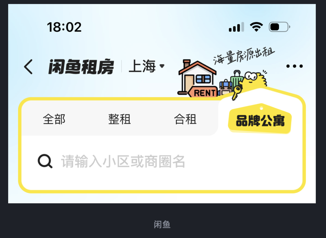 傳統(tǒng)租房板塊多以 “文字 + 普通卡片” 呈現(xiàn),用戶需先讀文字才能識(shí)別功能;閑魚(yú)則直接將 “房屋結(jié)構(gòu)” 轉(zhuǎn)化為視覺(jué)符號(hào) —— 卡片上用簡(jiǎn)化的房屋輪廓圖標(biāo)替代傳統(tǒng)標(biāo)簽,配合 “RENT” 英文標(biāo)識(shí),讓用戶一眼就能關(guān)聯(lián) “租房” 業(yè)務(wù)。這種設(shè)計(jì)不僅強(qiáng)化了業(yè)務(wù)屬性,還通過(guò)圖形化降低了信息識(shí)別成本,同時(shí)獨(dú)特的視覺(jué)符號(hào)也加深了用戶對(duì)產(chǎn)品的記憶度。