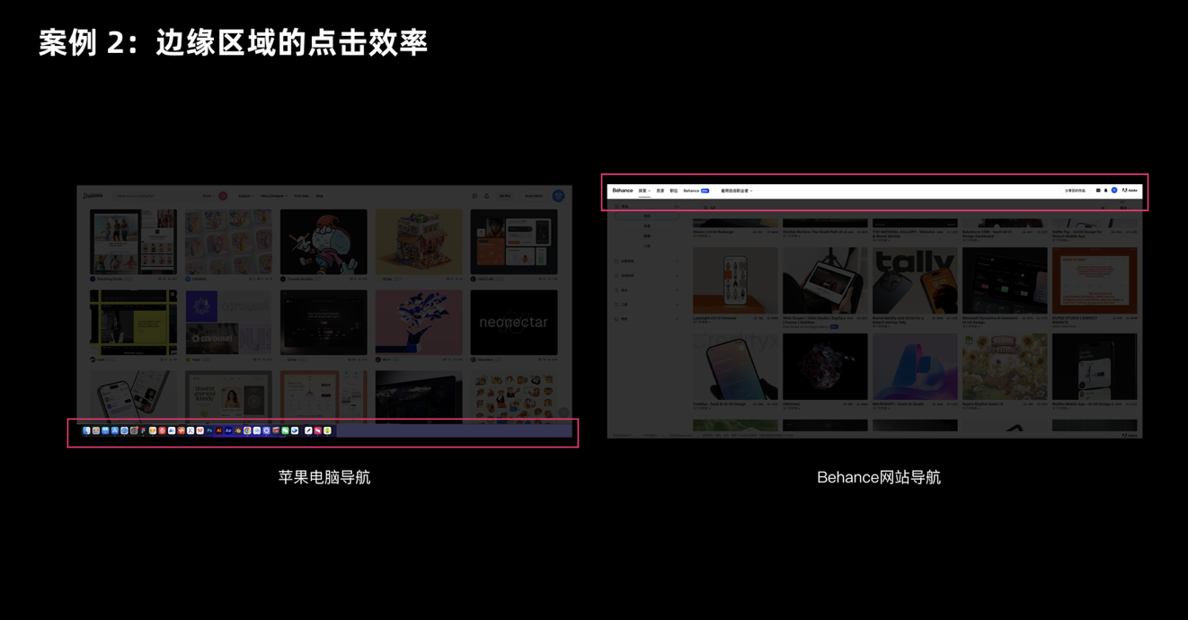 屏幕邊緣是被很多設(shè)計師忽略的 “黃金區(qū)域”—— 因為邊緣能擋住手指或鼠標(biāo)的移動,相當(dāng)于給目標(biāo)加了 “天然邊界”,用戶不用刻意控制精度就能快速定位。這就是為什么 Mac 的 Dock 欄、Windows 的任務(wù)欄都放在屏幕底部或側(cè)邊,而不是中間。