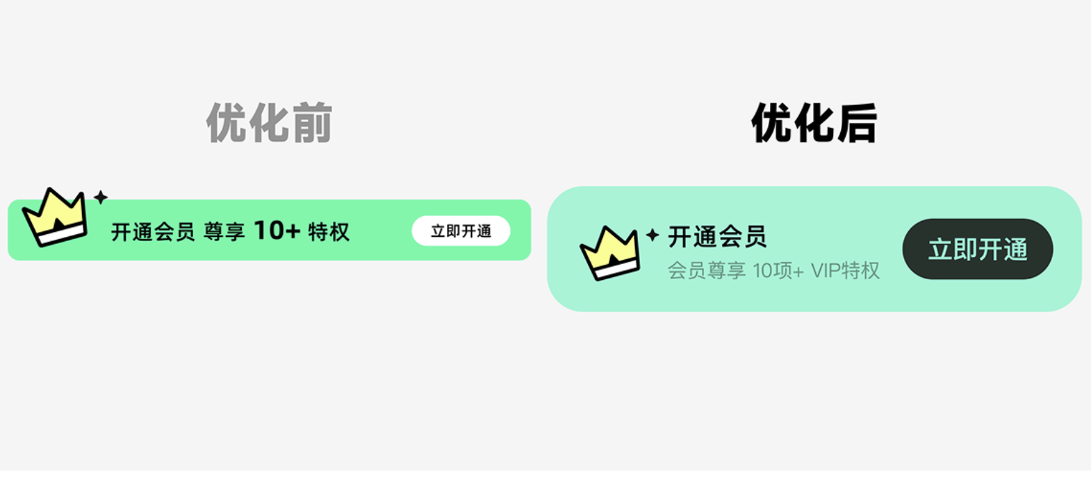 之前的 “開通會員” 入口,就一句話 “開通會員 尊享 10 + 特權” 加個小按鈕,平平無奇。優(yōu)化時我們分了三步 “造層次”: