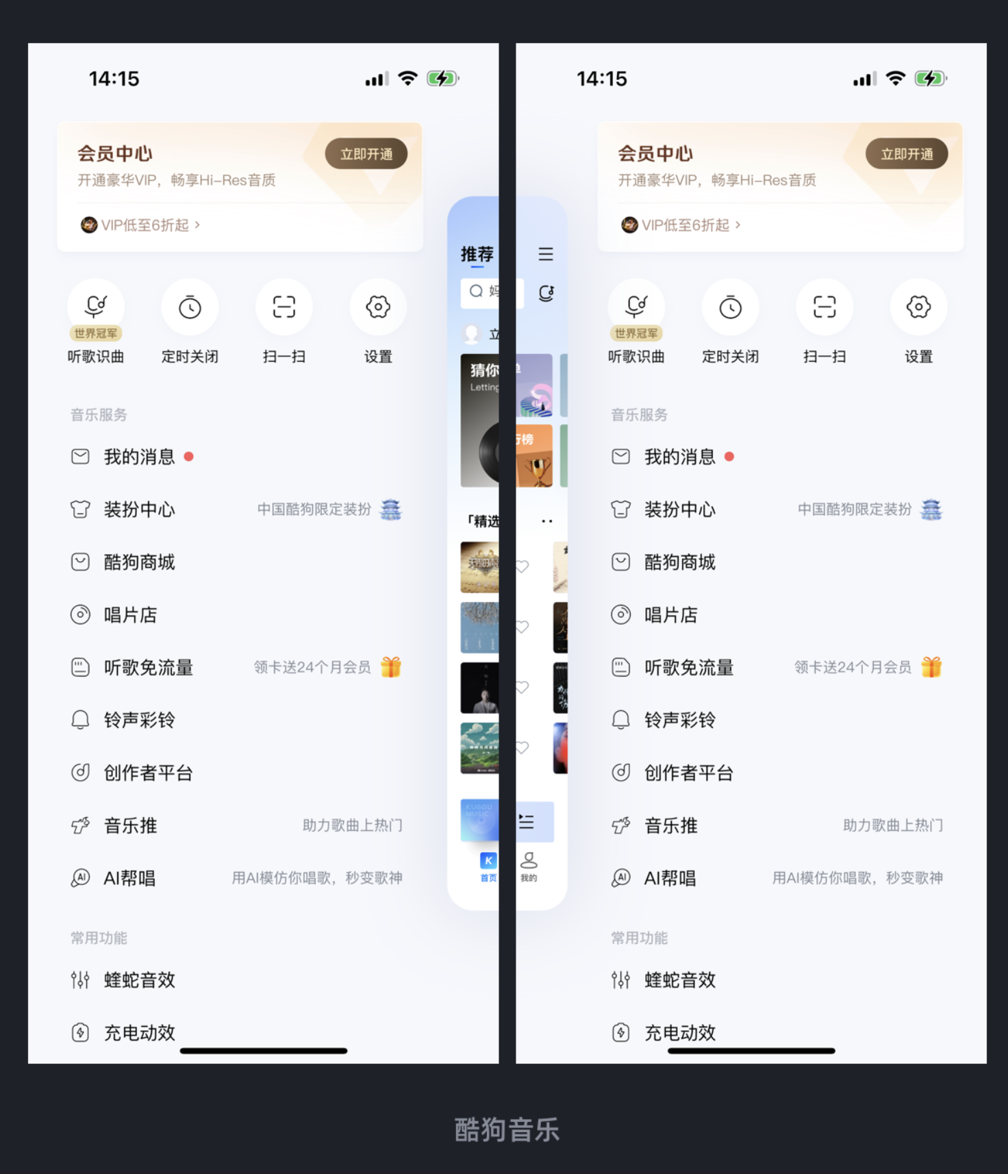 好的導(dǎo)航設(shè)計會兼顧不同用戶的操作習(xí)慣。酷狗音樂將底部標(biāo)簽欄與抽屜式導(dǎo)航結(jié)合,高頻功能直接展示,低頻功能集中收納。考慮到大屏手機(jī)用戶的單手操作需求,它既支持點擊右上角圖標(biāo)從右側(cè)打開導(dǎo)航,也允許左手貼邊右滑從左側(cè)開啟,完美適配左右手習(xí)慣的用戶。