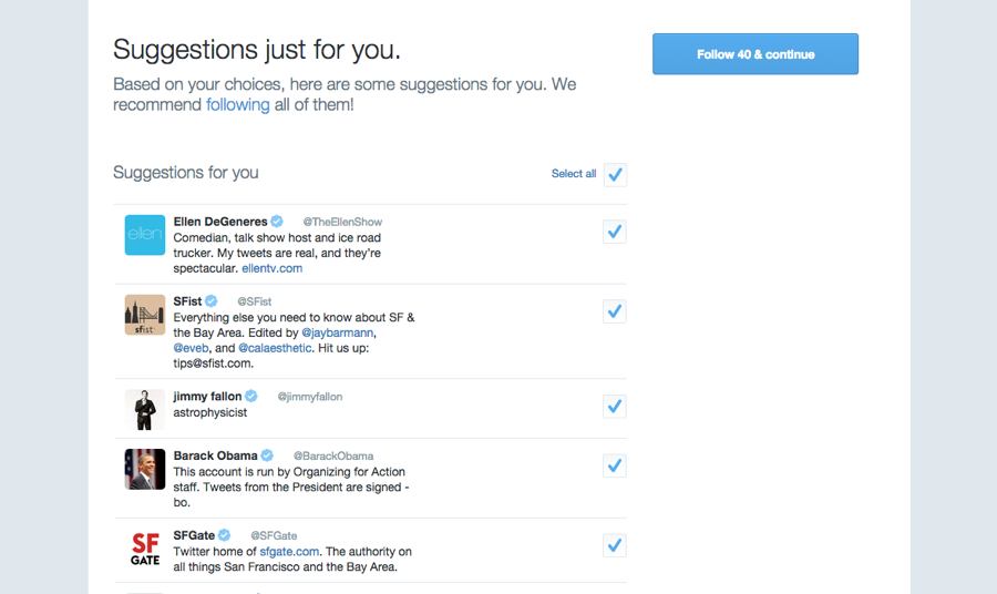 例如,Twitter為了強(qiáng)化習(xí)慣路徑,在新手引導(dǎo)流程中建議新用戶可以關(guān)注的人。一旦確定某個路徑能促進(jìn)用戶路轉(zhuǎn)粉,你也會想做類似的事情。