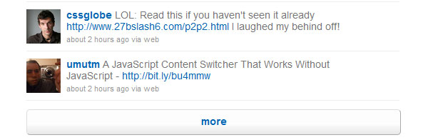 這種方式有一種變異版(或者說另外一種方式)。與不間斷的滾動顯示數(shù)據(jù)不同,在列表的最后,用戶可以選擇點擊更多按鈕瀏覽數(shù)據(jù)。Twitter就是這樣的一個好范例。