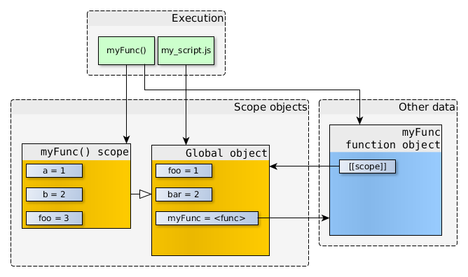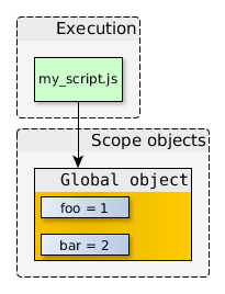 在上面的代碼中,我們有一個(gè)執(zhí)行的上下文(myscript.js自身的代碼),以及它所引用的作用域?qū)ο蟆H謱?duì)象里面還含有很多不同的屬性,在這里我們就忽略掉了。