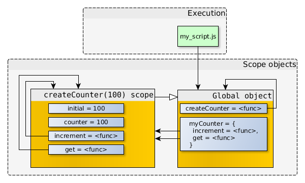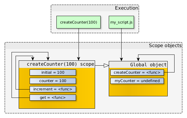 在myCounter.get()運(yùn)行的過(guò)程中,作用域鏈最底層的對(duì)象就是get() scope,這是一個(gè)空對(duì)象。所以,當(dāng)myCounter.get()訪問(wèn)counter變量時(shí),JavaScript在get() scope中找不到這個(gè)屬性,于是就向上到createCounter(100) scope當(dāng)中查找。然后,myCounter.get()將這個(gè)值返回。
