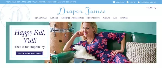 看看 Draper James 的服裝網(wǎng)站吧。首頁大圖中最吸引人的大概是妹子臉上的微笑吧?明亮的色彩給用戶愉悅的體驗,而隨后的文案內(nèi)容“Happy Fall,Y’all”它將秋季的愉悅情緒毫不掩飾地表露出來,用戶在這個時候可以直接地體會到設(shè)計師的情感。當(dāng)然,這樣的設(shè)計針對性很明顯,有一部分用戶可能會因此離開,但是你需要針對這個進(jìn)行判斷。