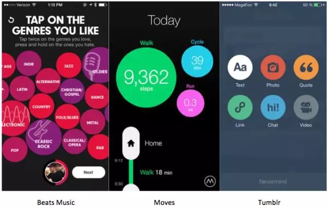 Beats Music把選擇喜歡的標簽設計成了圓形,這就比普通的列表、矩形tag的感覺要好很多,更加趣味更具探索性。Movse每天走的步數(shù)、消耗的卡路里均用圓形承載,是數(shù)據(jù)可視化、關鍵信息顯性化的最好案例。Tumblr則把要創(chuàng)建的內(nèi)容的類型選擇,用蒙層+圓形選項按鈕來設計,讓選擇變得專注而明確,又不那么死板。