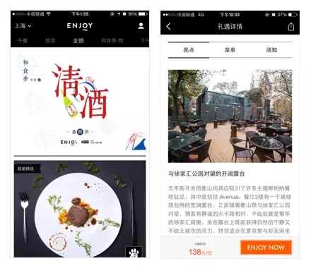 當(dāng)然,如果不是內(nèi)容為主的App,沒(méi)有太多的排版需求的話,不妨可以像iFashion,或者又是飯本出品的精選限量美食App—ENJOY—這樣,通過(guò)直接了當(dāng)?shù)暮诰€分割,也是不失干脆利落。