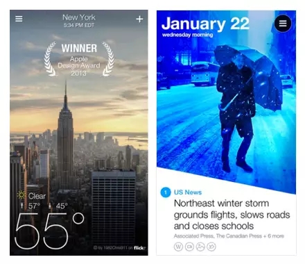 例如以設(shè)計(jì)精美著稱的Yahoo的兩款明星App產(chǎn)品Yahoo Weather!和Yahoo Digest。除了在產(chǎn)品設(shè)計(jì)上的和突出表現(xiàn)外,模糊和斜切的手法,給整個(gè)產(chǎn)品的品牌氣質(zhì)提升到了一個(gè)新的高度。 Yahoo Weather! 不論是在布局、字體和色彩的運(yùn)用上都顯得精致細(xì)膩,滑動(dòng)時(shí)高斯模糊的處理更是流暢平滑。Yahoo Digest 的斜切突出一個(gè)“破”,在不影響照片內(nèi)容的前提下,既能在視覺(jué)上顯得與眾不同,又在排版上巧妙地為色彩標(biāo)簽留了一角之地。比起一刀平,更顯靈動(dòng)而不失平衡感。