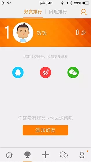 “樂動(dòng)力”的好友排行頁面,在沒有添加過好友的情況下,該頁面展示了一些社交網(wǎng)絡(luò)的圖標(biāo)和大大的添加按鈕提示用戶可以通過綁定社交賬號(hào)來找到更多好友一起PK運(yùn)動(dòng)量。