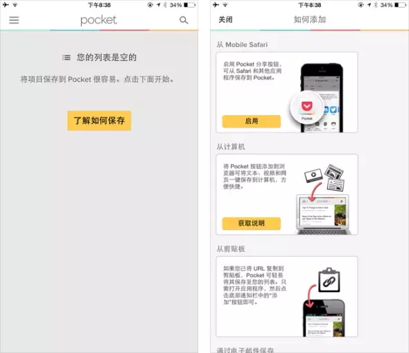 Pocket是一個(gè)可以讓用戶把內(nèi)容(文字、圖片甚至視頻)一鍵保存下來,用于其他時(shí)間完成閱讀的工具。在初次使用時(shí)它的列表頁面內(nèi)沒有內(nèi)容時(shí),會(huì)顯示一個(gè)“了解如何保存”的按鈕,點(diǎn)擊可以詳細(xì)了解添加列表的各種方法。
