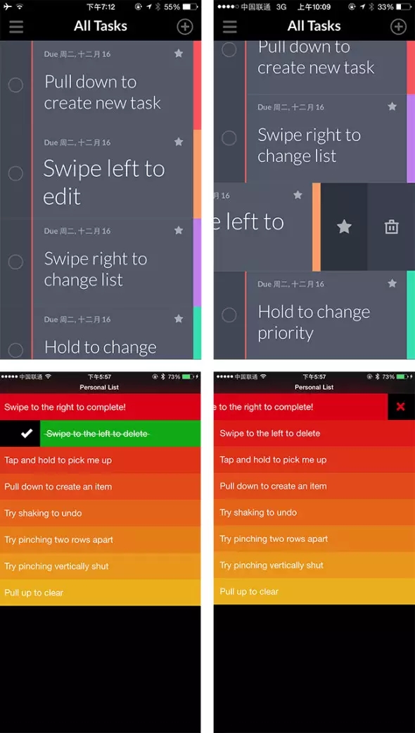 Taasky和Clear作為兩款交互優(yōu)秀的任務(wù)應(yīng)用,都擁有非常豐富手勢(shì)操作,它們沒有像別的軟件一樣在界面上加遮罩、標(biāo)注做出冗長的用戶教育頁,而是直接將操作指引嵌在一條條的任務(wù)里,用戶只要跟著當(dāng)前任務(wù)的簡單描述滑動(dòng)屏幕就能了解全部手勢(shì)操作,即充實(shí)了原本空白的缺省頁面又很自然地指導(dǎo)用戶如何使用該軟件。