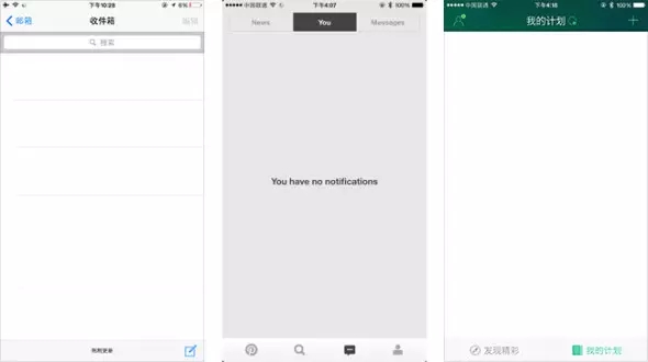 缺省頁面,是出現(xiàn)在用戶沒有提交任何資料或者網(wǎng)絡(luò)連接不通暢的情況下所展現(xiàn)的頁面。通常設(shè)計(jì)師們習(xí)慣用豐富的數(shù)據(jù)內(nèi)容把頁面設(shè)計(jì)得美觀實(shí)用,考慮的都是界面展現(xiàn)的“理想狀態(tài)”,往往會(huì)忽視沒有內(nèi)容的“缺省狀態(tài)”。未經(jīng)過精心設(shè)計(jì)的缺省頁面降低了用戶的使用體驗(yàn),并可能給用戶帶來困擾,如下圖iOS系統(tǒng)郵件App,無郵件時(shí)界面上沒有任何有效反饋信息,用戶不能明確得知到底是網(wǎng)絡(luò)問題還是賬號(hào)同步出錯(cuò)亦或者是收件箱內(nèi)確實(shí)一封郵件都沒有。同樣的情況也出現(xiàn)在Pinterest和出發(fā)吧的界面里。