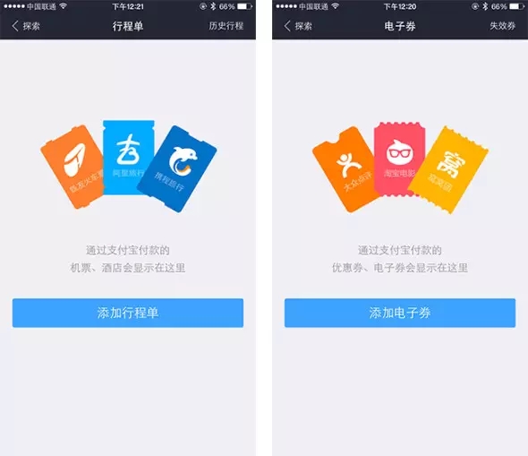 支付寶錢包的電子券和行程單頁面通過票據(jù)圖形+文字清楚地說明該分類下會(huì)出現(xiàn)什么內(nèi)容,并在屏幕下方提供添加票據(jù)的按鈕。