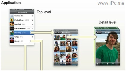 在iPhone 平臺上,如果應用程序有信息層級關系(比如郵箱> 收件箱> 郵件),利用title 進行導航, 導航欄左側始終是返回按鈕,右側如果有必要,可以放針對內容的操作控件,中間有標題。