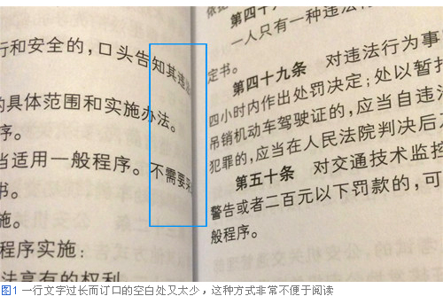 在設(shè)計工作中,如果有100個人就會有100種設(shè)計理論,我認(rèn)為并不能總結(jié)出一條絕對正確的理論。但是,如果完全沒有什么設(shè)計理論的話,貌似會使設(shè)計顯得很奇怪。比如,經(jīng)常會看到這種書籍(圖1),一行文字過長而訂口的空白又處理得不太合適。只要看到這樣的設(shè)計,馬上就會想到“這里好像沒有規(guī)則啊”,還會讓人產(chǎn)生“這本書的設(shè)計師好像不讀書啊”這樣的感覺。在閱讀過程中哪怕只有一些地方令人難以理解,也會讓人精神不集中,不能徹底關(guān)注文章本身。如果是一個讀書的人,他自己看看這樣的設(shè)計,自己也會感到這種方式不便于閱讀啊。所以我認(rèn)為電子書的閱讀感受也是這樣,要做出理想的版面,作為設(shè)計者需要站在讀者的角度考慮,應(yīng)該尋找對于自己來說便于閱讀的排版。因此,也借此機會來整理出網(wǎng)易云閱讀產(chǎn)品中,書籍正文文字排版的相關(guān)規(guī)則。