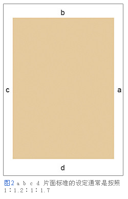首先在書籍編排過程中,設(shè)定頁面四周的余白來安排頁面的排版。頁邊空白的大小不同,排版效果給讀者帶來的印象也會發(fā)生變化,因此需要適當(dāng)?shù)剡M行處理。雖然紙質(zhì)書籍已經(jīng)有了莫里斯所提倡的版面設(shè)定理論,但是這些理論并不適合于顯示在硬件設(shè)備上。因此我們需要根據(jù)不同的媒體特點來進行處理。如圖(2) 有顏色的部分是版面,abcd版面標(biāo)準(zhǔn)的設(shè)定通常是按照1:1.2:1:1.7的比例來進行設(shè)計。