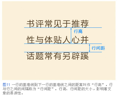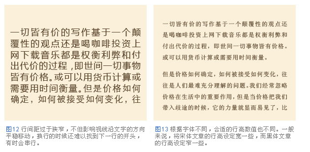 行高,行間距的大小對文章的易讀性有很大的影響。行與行之間拉得過開,從一行末尾移動到下一行開頭,視線的移動距離過長增加了閱讀難度。相反,行與行之間貼得過緊,上下挨得過緊影響了視線的移動,讓人不知道正在閱讀哪一行(圖12)。正文最恰當(dāng)?shù)男懈撸緫?yīng)該設(shè)定為其文章中文字大小的兩倍。例如文字大小為8px的文章,就應(yīng)該把行高設(shè)定為16px(圖13)