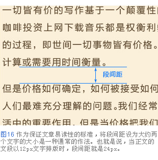 作為保證文章易讀性的標(biāo)準(zhǔn),將段間距設(shè)為大約兩個文字的大小是一種通常的作法。也就是說,當(dāng)正文的文段以12p文字排版時,段間距就是24px。當(dāng)然,這個標(biāo)準(zhǔn)也并不是絕對的,有時候也可以通過刻意地設(shè)定狹窄的段間距,給讀者帶來內(nèi)容緊湊的印象。