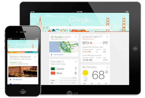 我們都知道你的app和網(wǎng)站在不同的設(shè)備下保持適配是一件很重要的工作。而卡片式設(shè)計(jì)就能很好的幫助我們來(lái)完成這一點(diǎn)。卡片式設(shè)計(jì)從根本上來(lái)說(shuō)就是將頁(yè)面內(nèi)容進(jìn)行分解,然而再整合一個(gè)無(wú)法再進(jìn)行分解的元素。而響應(yīng)式設(shè)計(jì)要求的就是我們可以根據(jù)屏幕尺寸的大小對(duì)頁(yè)面內(nèi)容就行調(diào)整。卡片式設(shè)計(jì)就可以對(duì)頁(yè)面內(nèi)容進(jìn)行分割重組來(lái)適應(yīng)不同的屏幕。比如這個(gè)Google在手機(jī)設(shè)備上顯示一個(gè)卡片,pad端顯示兩個(gè)卡片。