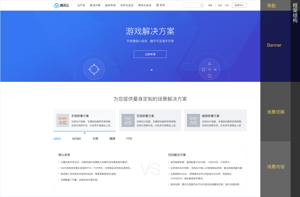 (如下圖所示為常見網(wǎng)頁形態(tài)結(jié)構(gòu),整個頁面UI開發(fā)同學(xué)需要得到的其實是設(shè)計師確認的框架結(jié)構(gòu),至于里面的圖標(biāo)、banner配圖、抑或是文字內(nèi)容都是可以后面提供的。具體來說,如下圖中,場景切換部分為三分陣列版式,灰色方框為圖標(biāo)占位預(yù)留,UI開發(fā)同學(xué)只需要圖標(biāo)占位尺寸即可,圖標(biāo)細節(jié)和形態(tài),設(shè)計師在后面完成整體頁面框架后-上線前補齊即可。)