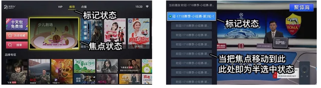 可能需要簡單講述一下“標(biāo)記狀態(tài)”和“半選中狀態(tài)”:“標(biāo)記狀態(tài)”在PC和手機端也非常常見,比如告知用戶所在位置在哪里的Tab標(biāo)記;而“半選中狀態(tài)”是“焦點狀態(tài)”的一種情況,即移動到某個焦點后,不進(jìn)行加載或觸發(fā)操作,需按“OK鍵”才觸發(fā),如圖15所示。這種狀態(tài)在早期電視盒子性能不足、在Tab切換時經(jīng)常需要使用,因為如果直接切換焦點時就加載,可能會造成卡頓。
