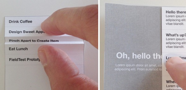 左邊的界面中,通過紙張的折疊來模仿 Clear 界面的拉伸添加條目,右邊的界面,則是模仿 Path 中滑動展現(xiàn)分層。在把完折紙的過程中,Juan Sanchez 發(fā)現(xiàn),可以將折疊使用在滑動分層上,即將上一層的信息折疊下來,展示下一層的內(nèi)容,是一種很有創(chuàng)意的交互方式。