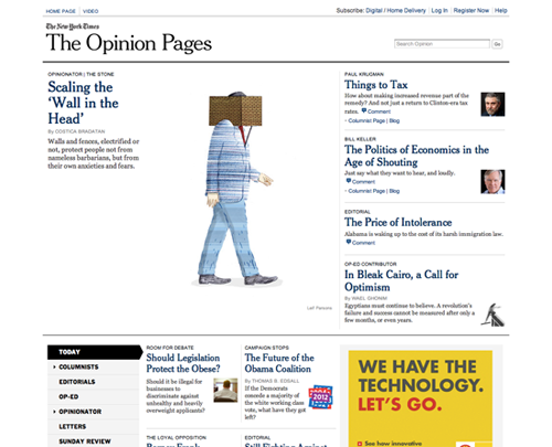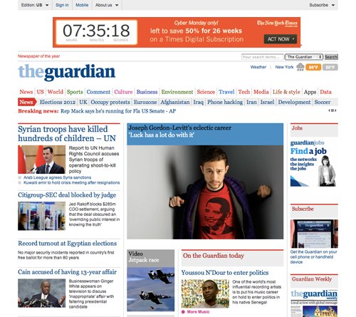對(duì)于在線雜志或報(bào)紙一類(lèi)需要呈現(xiàn)大量?jī)?nèi)容的網(wǎng)站來(lái)說(shuō),要打造簡(jiǎn)潔的頁(yè)面設(shè)計(jì)方案則更加困難。不過(guò)英國(guó)的衛(wèi)報(bào)(The Guardian) 以及一些同類(lèi)型的在線報(bào)紙站點(diǎn)倒是向我們展示了通過(guò)固定寬度的網(wǎng)格布局實(shí)現(xiàn)簡(jiǎn)潔設(shè)計(jì)方案的可行性: