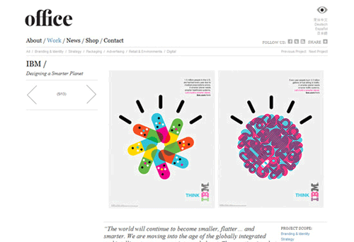 舉例來(lái)說(shuō),IBM的智能星球運(yùn)動(dòng) (Smarter Planet campaign)涉及到多個(gè)方面的主題,與其相關(guān)的印刷品、插畫(huà)、圖表、人機(jī)互動(dòng)素材等都遵從著同一套方案標(biāo)準(zhǔn),包括幾何框架、線條風(fēng)格、色彩飽和度等。無(wú)論是在網(wǎng)站,還是在平面媒體中,相關(guān)主題的視覺(jué)表現(xiàn)形式都具有高度的一致性。