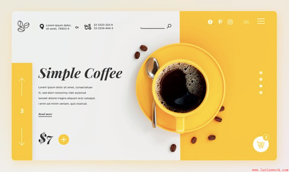 美食一般熱衷于黃色系,不僅給美食增色,也會讓人食欲大增。這個咖啡網(wǎng)站,深棕色的咖啡和咖啡豆配上亮黃色的杯子和背景,讓這杯濃濃的咖啡更加誘人。另一半背景則用淡淡的灰色作為陪襯,讓人的眼睛得到休息。