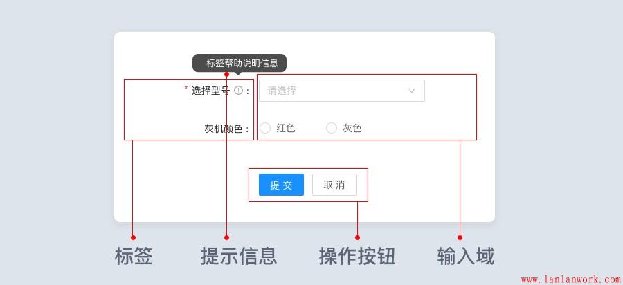 表單主要由這四類元素組成:標簽、輸入域、操作按鈕、提示信息。