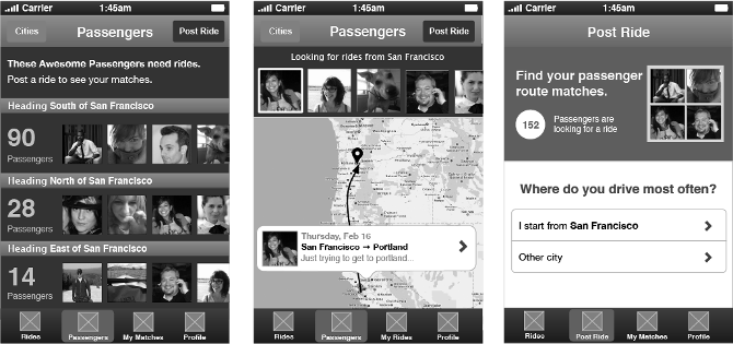 首先,我們分析了駕車者通常會(huì)出于怎樣的目的來發(fā)起拼車活動(dòng),并將這些原因列成一份清單。接下來,我(英文原文作者)對(duì)應(yīng)著這份清單繪制了一些簡(jiǎn)單的草圖,將有可能符合駕車者需求的功能和內(nèi)容初步的勾勒出來。然后,大家對(duì)這些草圖進(jìn)行討論評(píng)估,將其中我們認(rèn)為最可行的5個(gè)概念進(jìn)一步落實(shí)到線框原型當(dāng)中,并向一些目標(biāo)用戶(獨(dú)自駕車者)進(jìn)行了展示,通過他們的反饋來驗(yàn)證我們的假設(shè)。