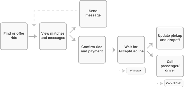 為此,我參考了其他一些協(xié)同消費(fèi) (Collaborative Consumption)類型的應(yīng)用產(chǎn)品,例如Airbnb 和Yardsale 等等。在嘗試了多種流程及界面布局方式之后,我們決定采用一種輕量級(jí)的確認(rèn)序列機(jī)制,它的操作界面類似于大家所熟悉的短消息界面。無論駕車者還是搭乘者都可以發(fā)起確認(rèn);例如,旅程結(jié)束后,一旦搭乘者完成了支付,駕車者收到款項(xiàng),此次拼車活動(dòng)就會(huì)被確認(rèn)完成。