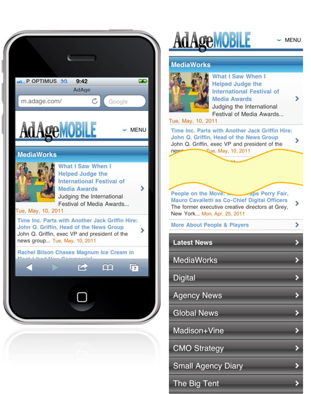 確實(shí)是這么回事。移動版本的站點(diǎn),在布局方面,應(yīng)該使主要內(nèi)容盡量多的占據(jù)著首屏當(dāng)中的空間,而導(dǎo)航結(jié)構(gòu)則應(yīng)該以某種縮略的形式出現(xiàn)在相對次要的位置。Wroblewski通過一個(gè)實(shí)例來倡導(dǎo)這個(gè)設(shè)計(jì)模式,也就是Ad Age的移動版站點(diǎn) 。其首屏當(dāng)中,除了網(wǎng)站標(biāo)題及內(nèi)容列表之外,右上角的菜單按鈕是界面當(dāng)中唯一一個(gè)交互控制元素。當(dāng)用戶點(diǎn)擊這個(gè)按鈕時(shí),導(dǎo)航列表才會出現(xiàn)在屏幕當(dāng)中。看上去,整個(gè)導(dǎo)航列表好像是另外一個(gè)界面,但它實(shí)際上是被放置在頁面最下方的,而菜單按鈕只是個(gè)錨點(diǎn)而已。