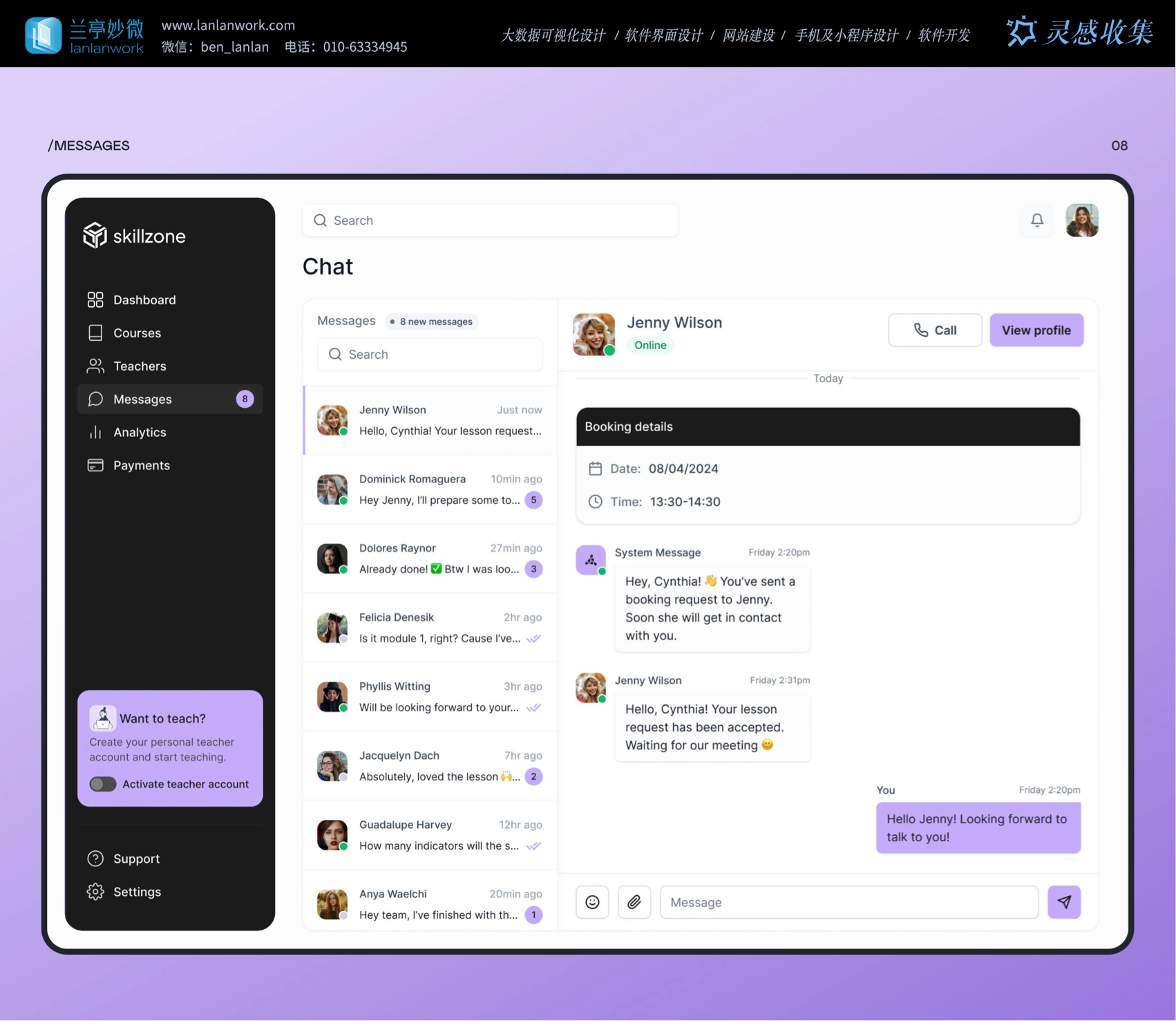 足多樣教學需求。消息模塊里,聊天界面實時顯示在線狀態(tài)、課程預約詳情,師生溝通方便又順暢。這些貼心設(shè)