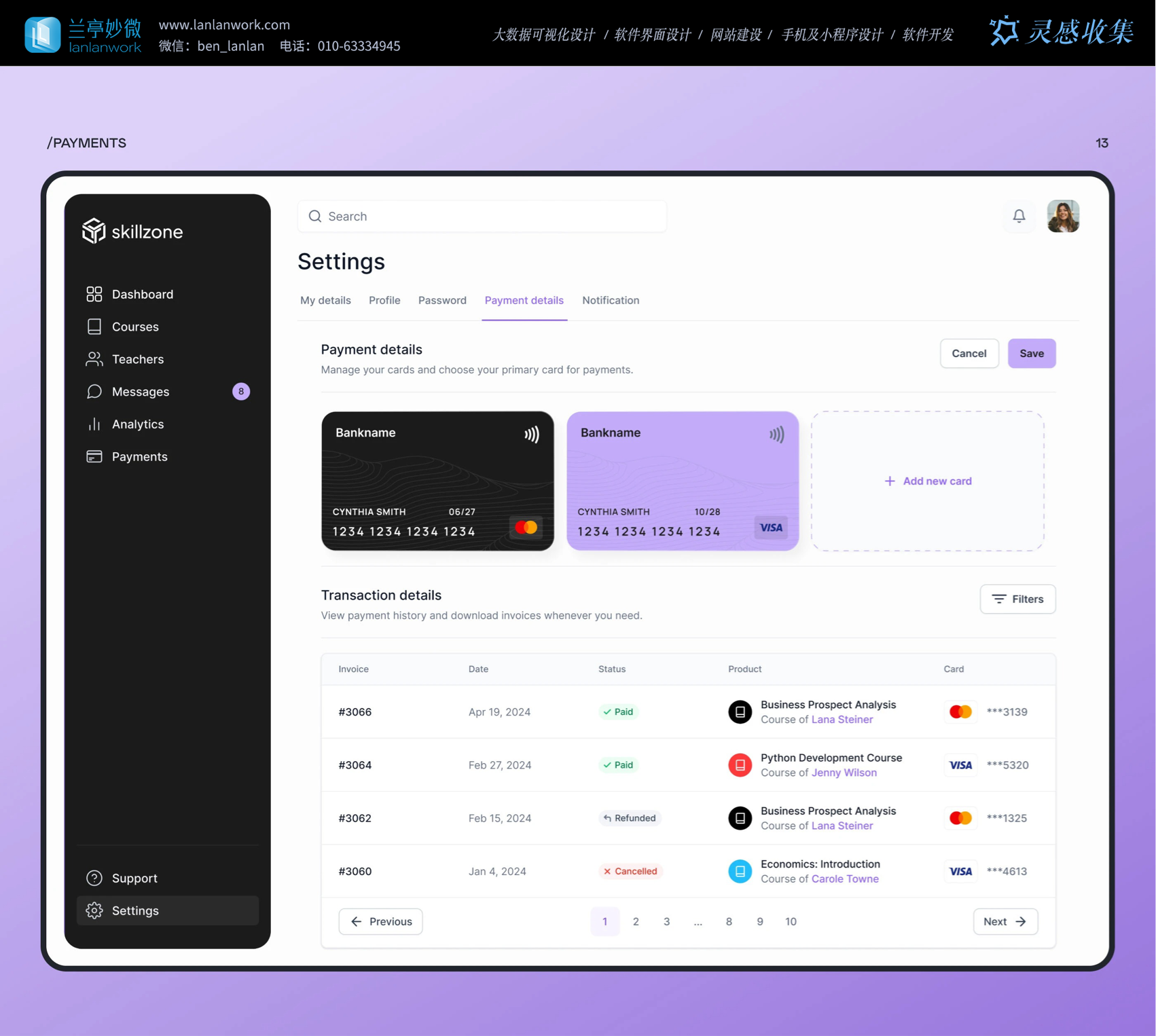 師)" 等功能,老師和學生能一鍵直達想去的板塊。主內(nèi)容區(qū)按功能模塊化,比如支付頁面,銀行卡信息用卡片