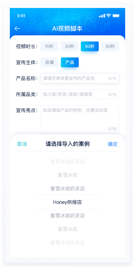AI生成視頻腳本是用戶輸入相應(yīng)條件后,AI大模型通過系統(tǒng)算法生成視頻內(nèi)容。整體風(fēng)格較為科技感,因此在配色上使用藍(lán)色漸變及較重投影,符合產(chǎn)品屬性,能夠突出產(chǎn)品的創(chuàng)新性和先進(jìn)性。使用戶在使用過程中感受到強(qiáng)烈的視覺沖擊和沉浸感,這種體驗有助于增強(qiáng)用戶對產(chǎn)品的興趣。