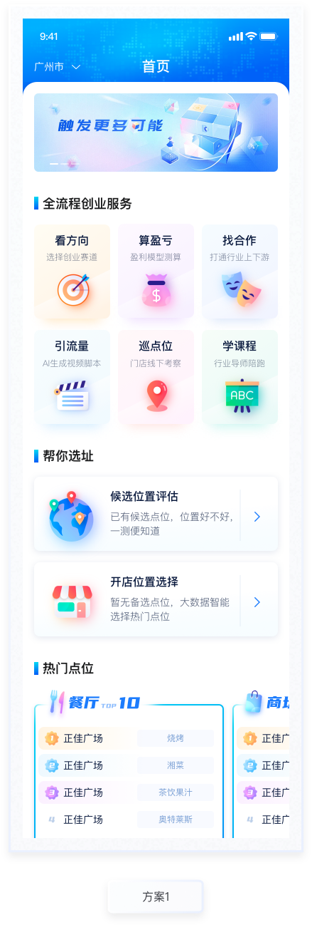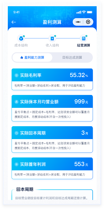 所盈利測算功能是產(chǎn)品的主要功能,通過AI對未來開店盈虧情況進(jìn)行預(yù)測評估。本次設(shè)計主要優(yōu)化該流程的交互及視覺表現(xiàn),整個流程分為“成本結(jié)構(gòu)”“收入結(jié)構(gòu)”“經(jīng)營測算”三個階段,過程填寫情況放置在頁面頂部,一步了然。已填寫使用主題色標(biāo)注,未填寫則使用置灰顏色處理,符合用戶基本感知。按鈕使用與主色相近的漸變色。