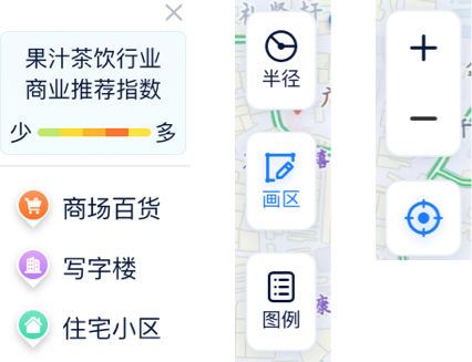 按鈕換膚在地圖上,“半徑”“選區(qū)”便于用戶對開店范圍的選擇,“圖例”則更側(cè)重圖標(biāo)說明性。“放大”“縮小”“定位”則是對顯示內(nèi)容的操作。