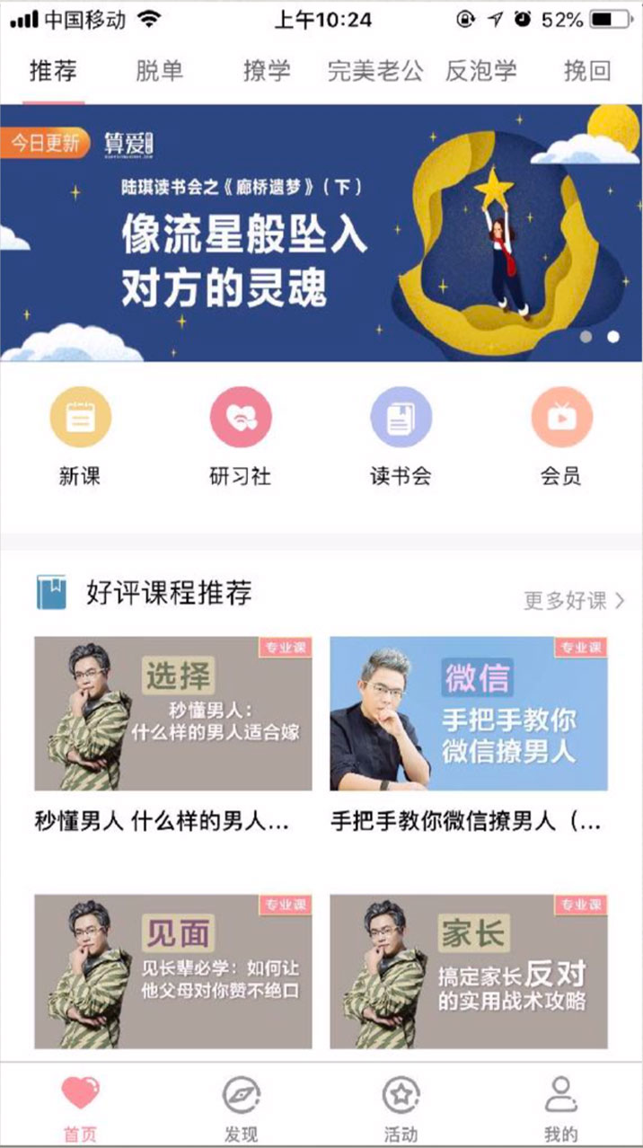 1.首頁根據(jù)產(chǎn)品的不同特色,設置了二級導航,將、脫單、撩學、完美老公、 反泡學、挽回等分類作為二級導航標題,既能用來統(tǒng)一呈現(xiàn)特色內(nèi)容,又能保證頁 面信息的層級關系清晰明了;