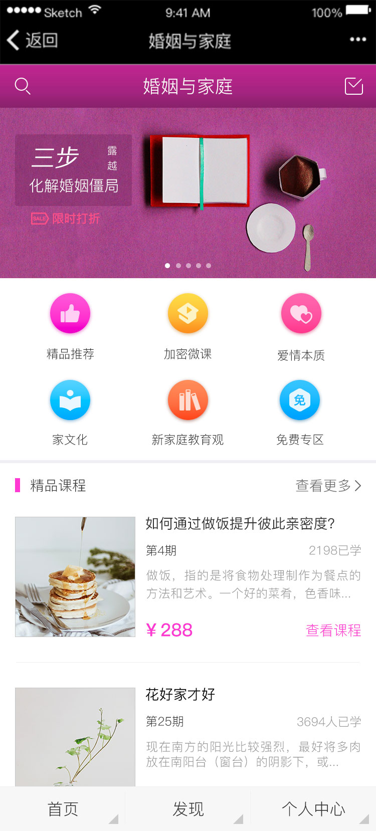 2.在交互上采用左右滑動的方式,保證用戶可以快速切換不同的內(nèi)容,精細 化的有助于幫助沒有明確目標的用戶快速找到感興趣的課程。