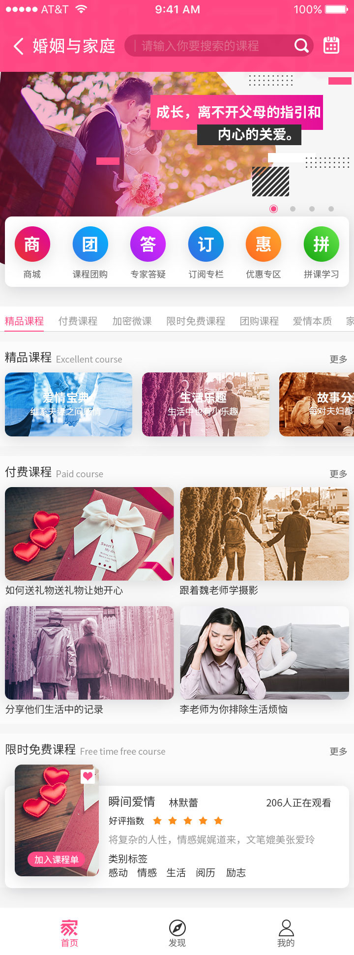 商城中除了對個人用戶的課程出售,還有對企業(yè)客戶的課程銷售。此外,還有一套完整的分享分銷體系,因此產(chǎn)品除了商城內(nèi)容展示及課程學習等常規(guī)流程外,還需要設計一套分銷體系和大客戶團購體系。我們在分析市場主流公眾號商城后,根據(jù)【婚姻與家庭】自身性質(zhì),規(guī)劃了一套滿足用戶需求的商城產(chǎn)品。